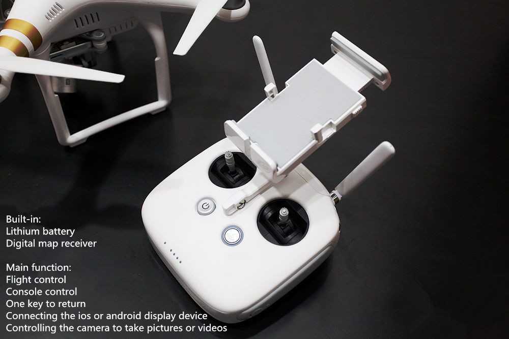 Besides, Phantom 3 owns one-key-to-return function on its remote controller. The controller has been built in a intelligent LiPo battery with large capacity that is chargeable and offers power indicators. Just have a look at the indicators, you can know how much power is left. Even better, if you connect your cellphone or tablet with the controller, the built-in battery will charge for them.